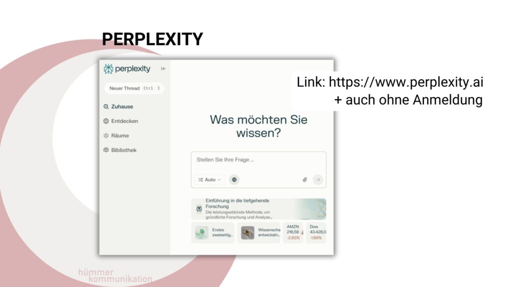 • *Perplexity AI: Direkt im Browser nutzbar, keine Anmeldung erforderlich; mit Anmeldung weiterführende Funktionen.
